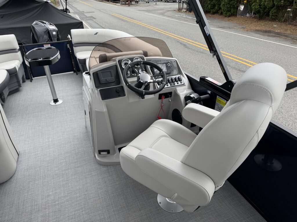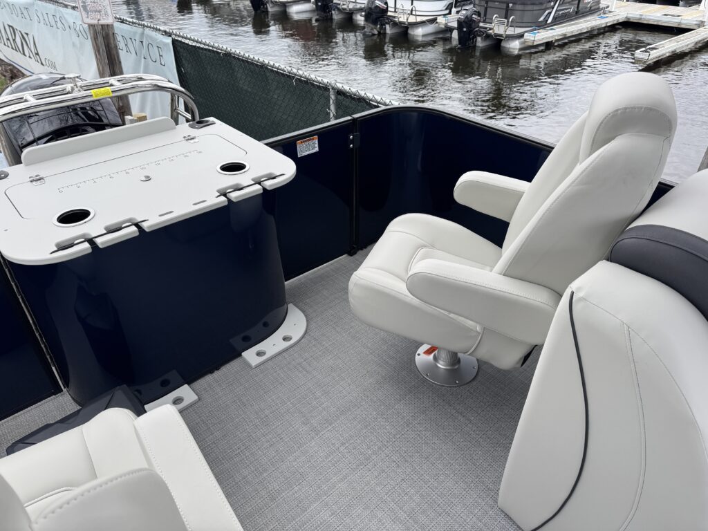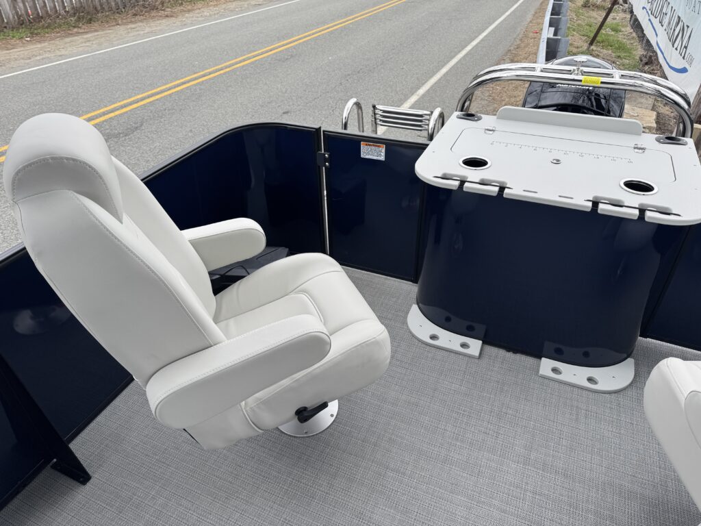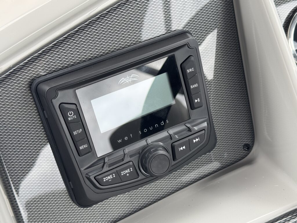Features on this new model include blue power bimini top and matching playpen cover, full sea weave flooring in grey, extended deck, three High Back helm chairs in platinum, power helm pedestal, Wet Sounds MC5 radio and sound system, GPS, deluxe exterior deck ski tow, and more!