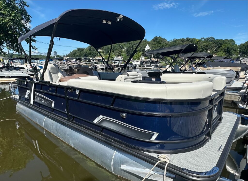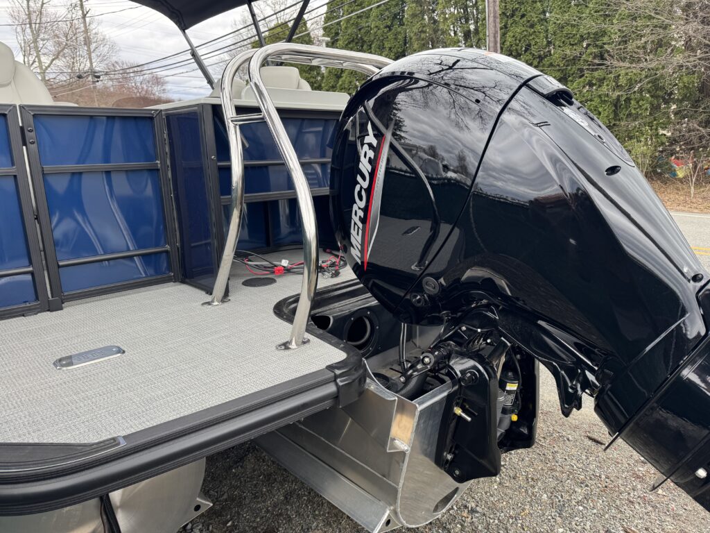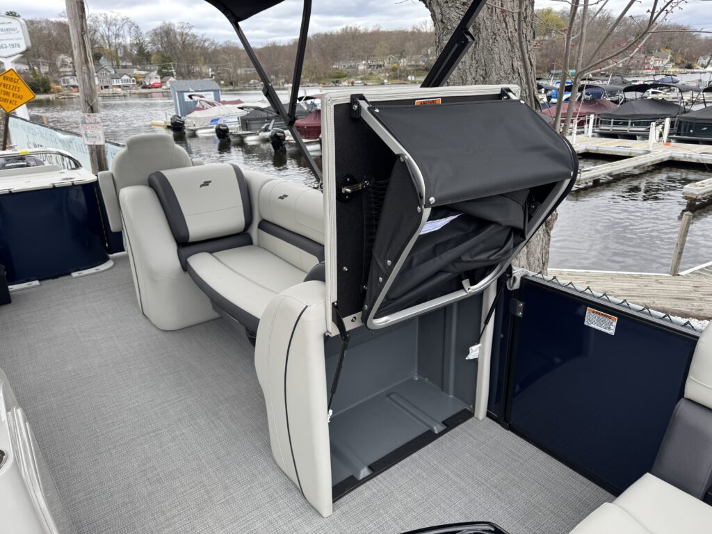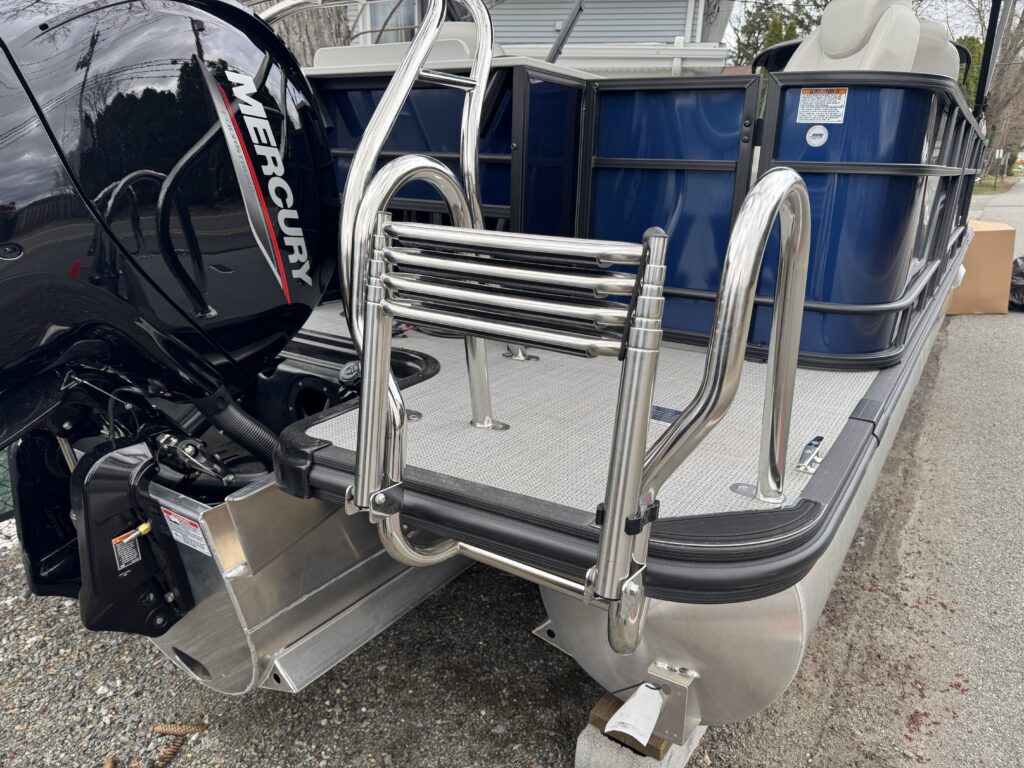Features on this new model include blue power bimini top and matching playpen cover, full sea weave flooring in grey, extended deck, three High Back helm chairs in platinum, power helm pedestal, Wet Sounds MC5 radio and sound system, GPS, deluxe exterior deck ski tow, and more!