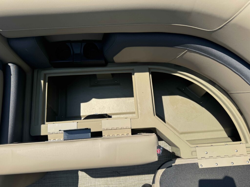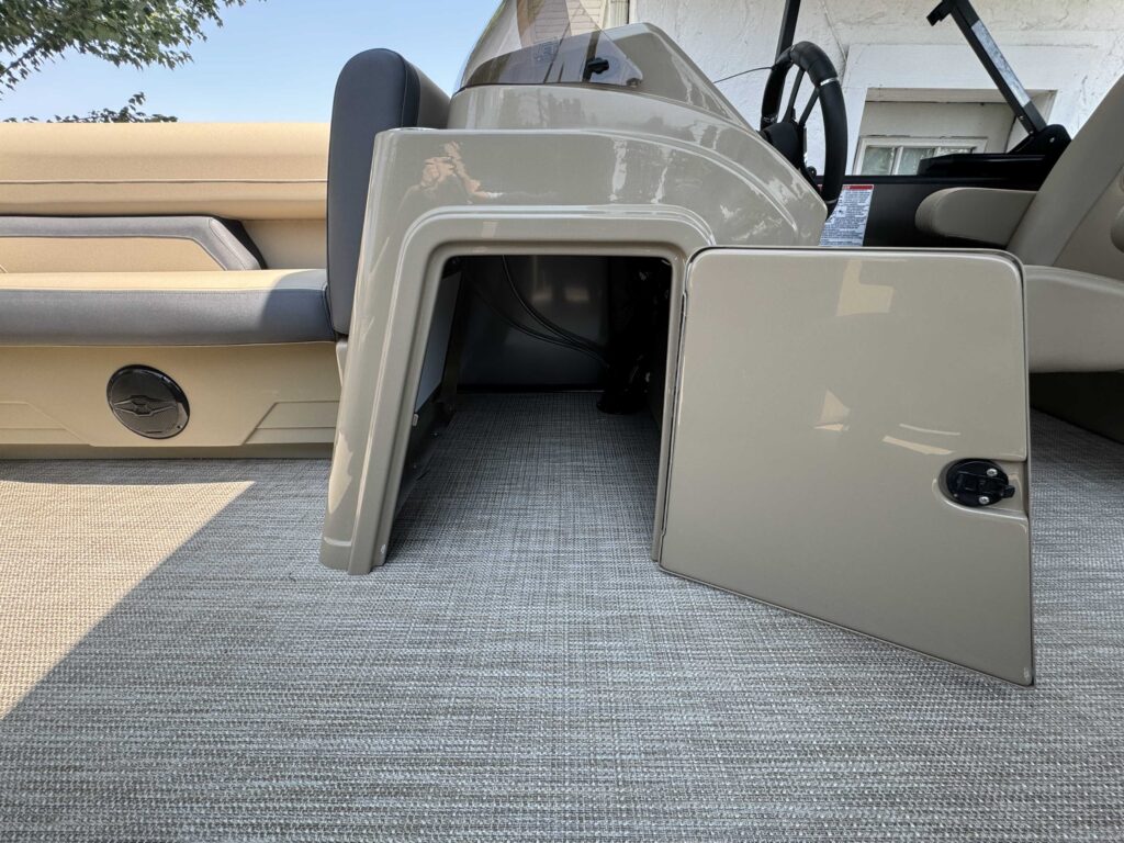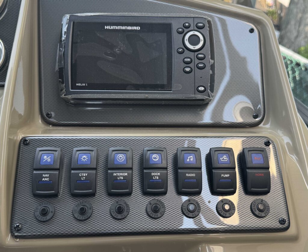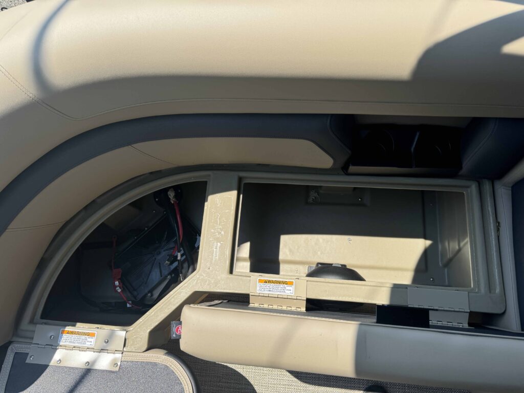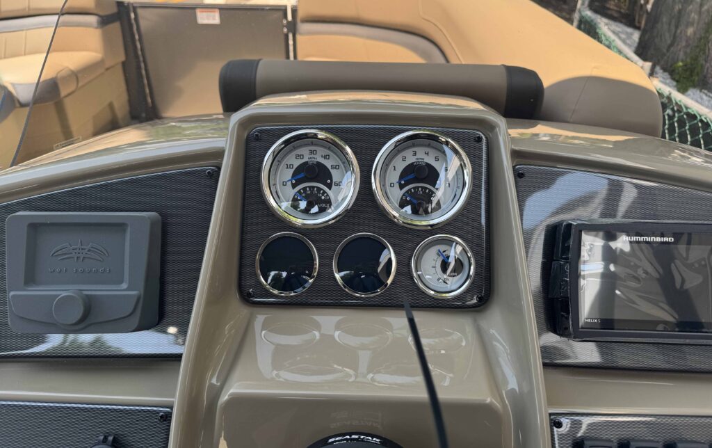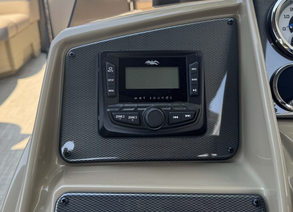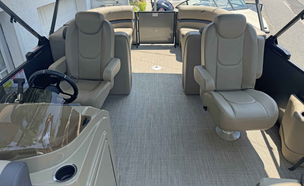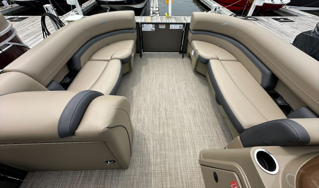 This EXS 3 is 23′ 8″ long with features including black power bimini top and playpen cover, full sea weave flooring in brown, High Back Helm chairs in mocha and tan, extended deck, hydraulic steering, GPS with mount, Wet Sounds MC5 radio with four speakers, ski tow pylon, and more!