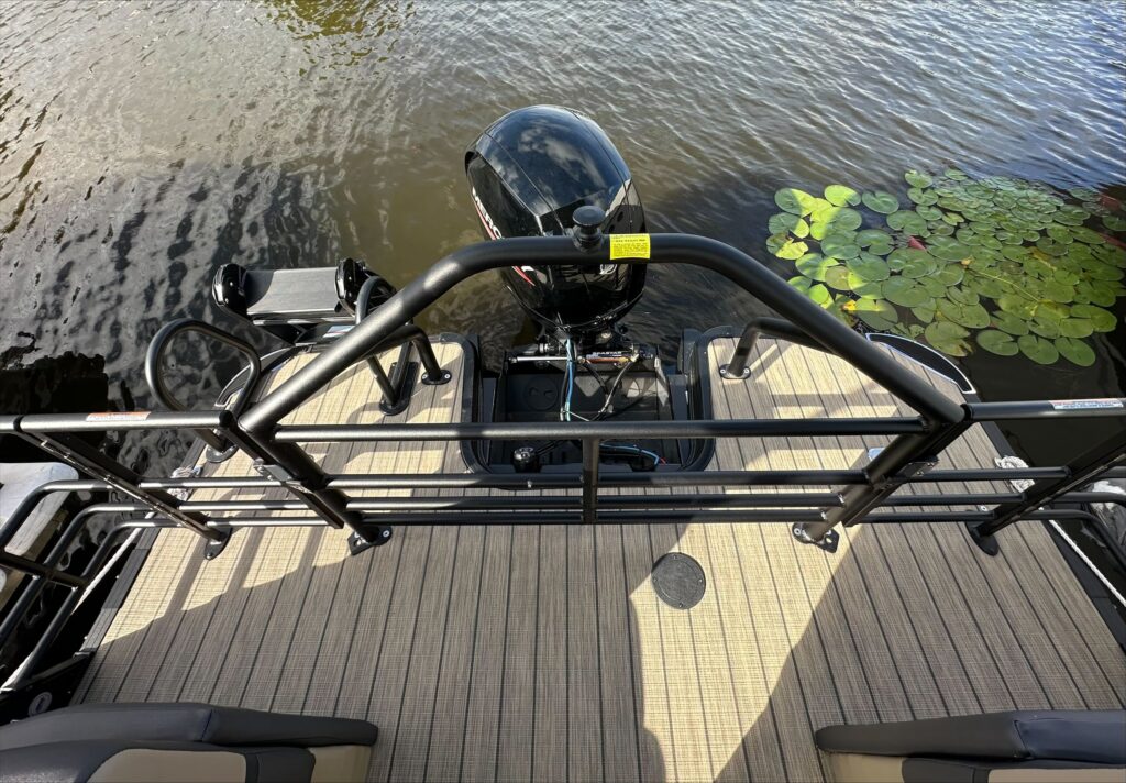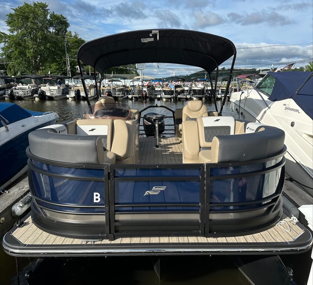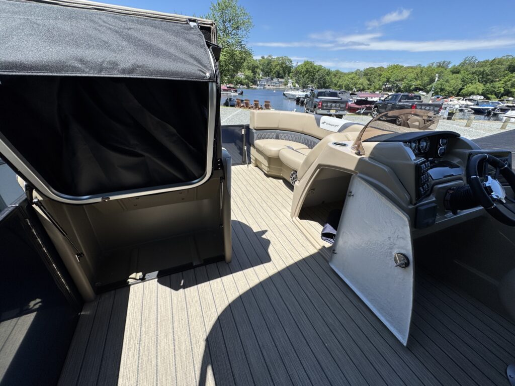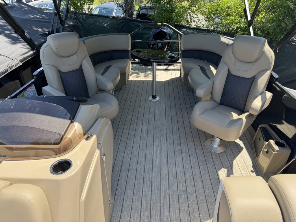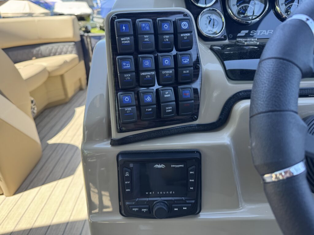 In addition to standard features, additional amenities on this brand new triple pontoon include blue power bimini top with matching playpen cover, full teak weave flooring in brown, extended deck, two High Back helm chairs in tan, Wet Sounds MC2 radio and sound system with four speakers, GPS with mount and antenna, mood lights, black Lillipad REVO ladder with handles, and more!
