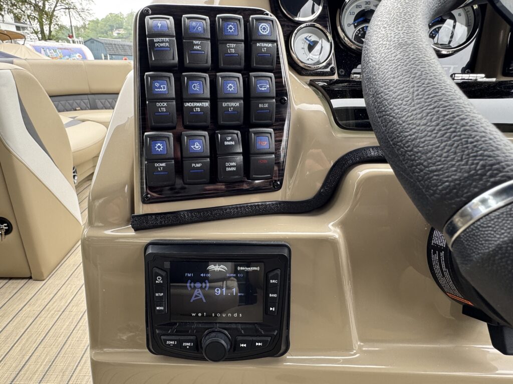 Suped up with exciting features including black power bimini top and matching playpen cover, full teak weave flooring in grey, extended deck, High Back helm chair in grey, power helm pedestal, power assist steering, Wet Sounds MC2 radio and sound system, GPS, mood lights, Lillipad REVO ladder with handles, and more!