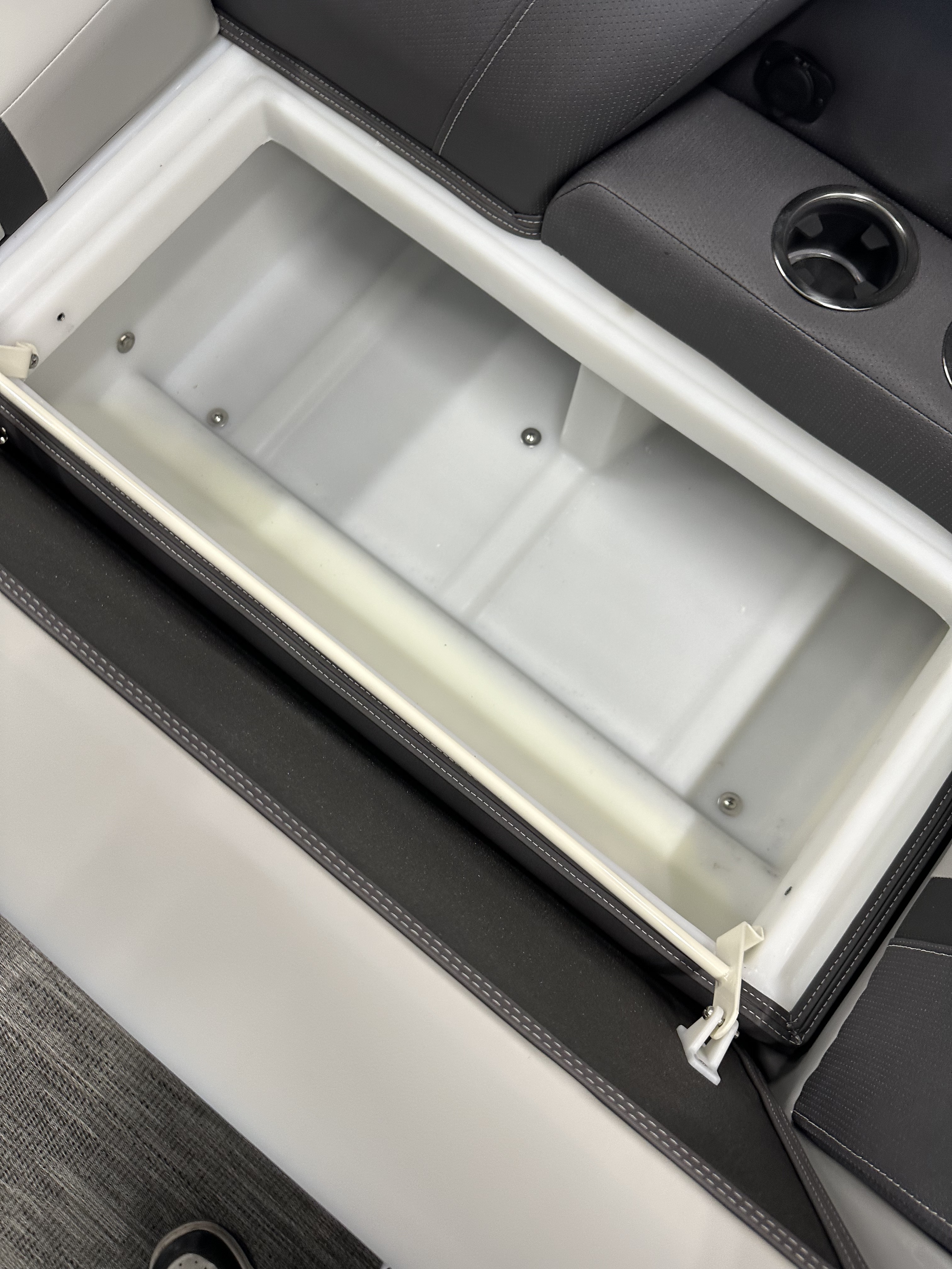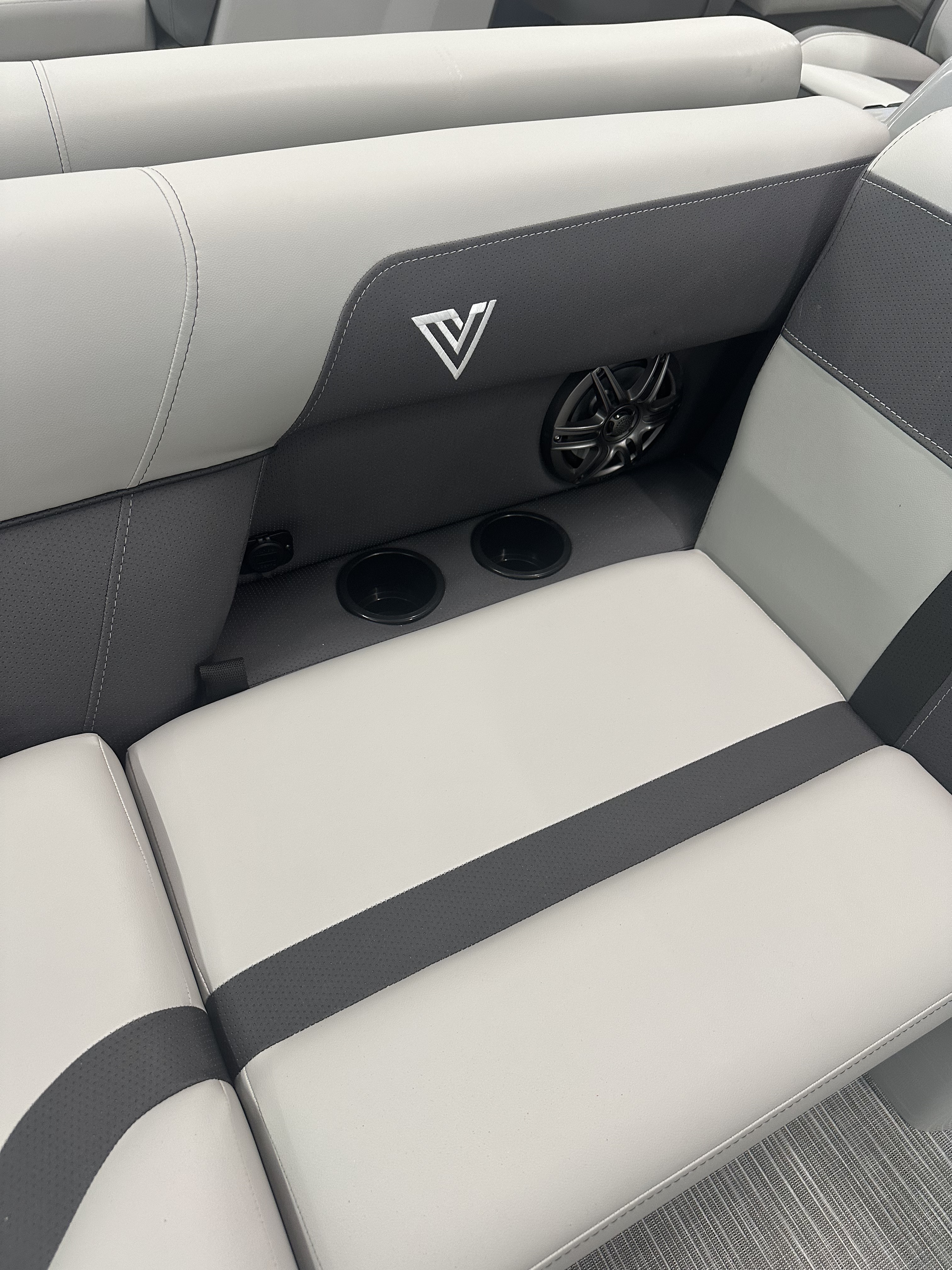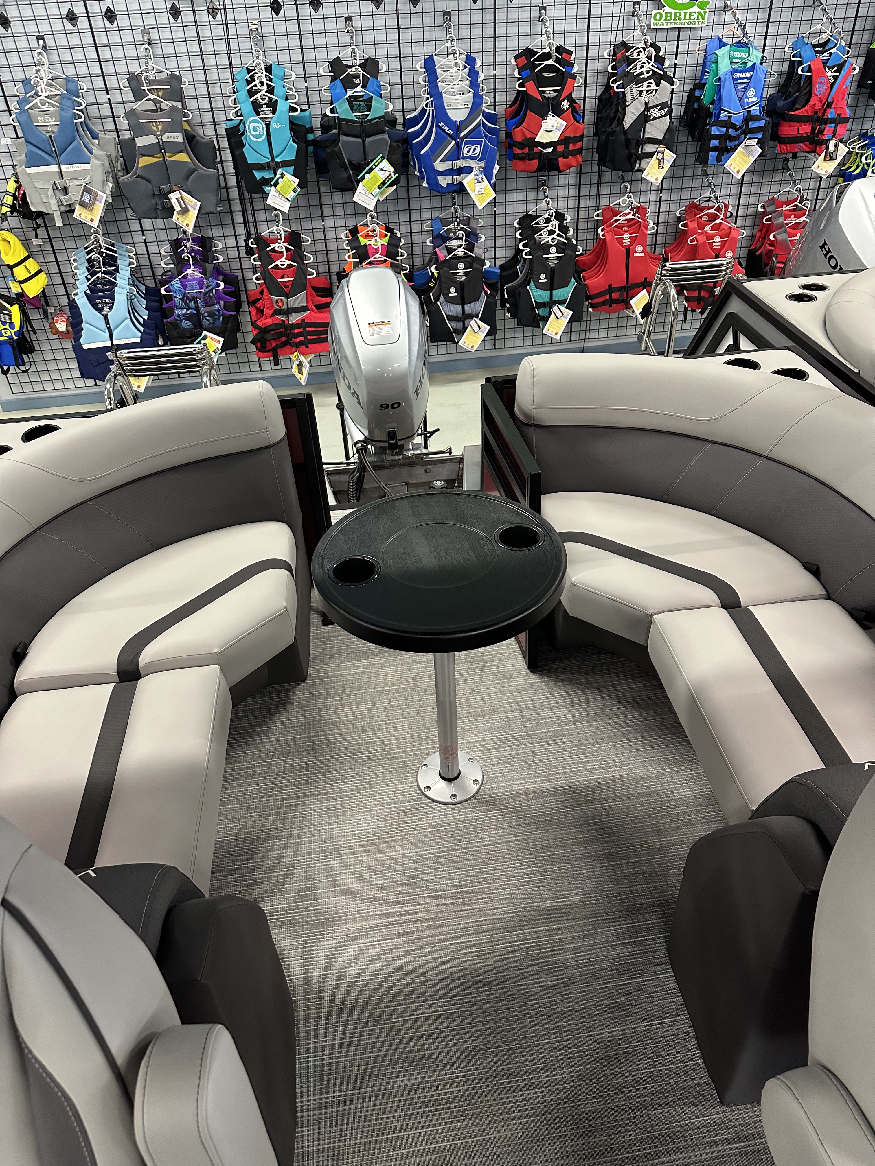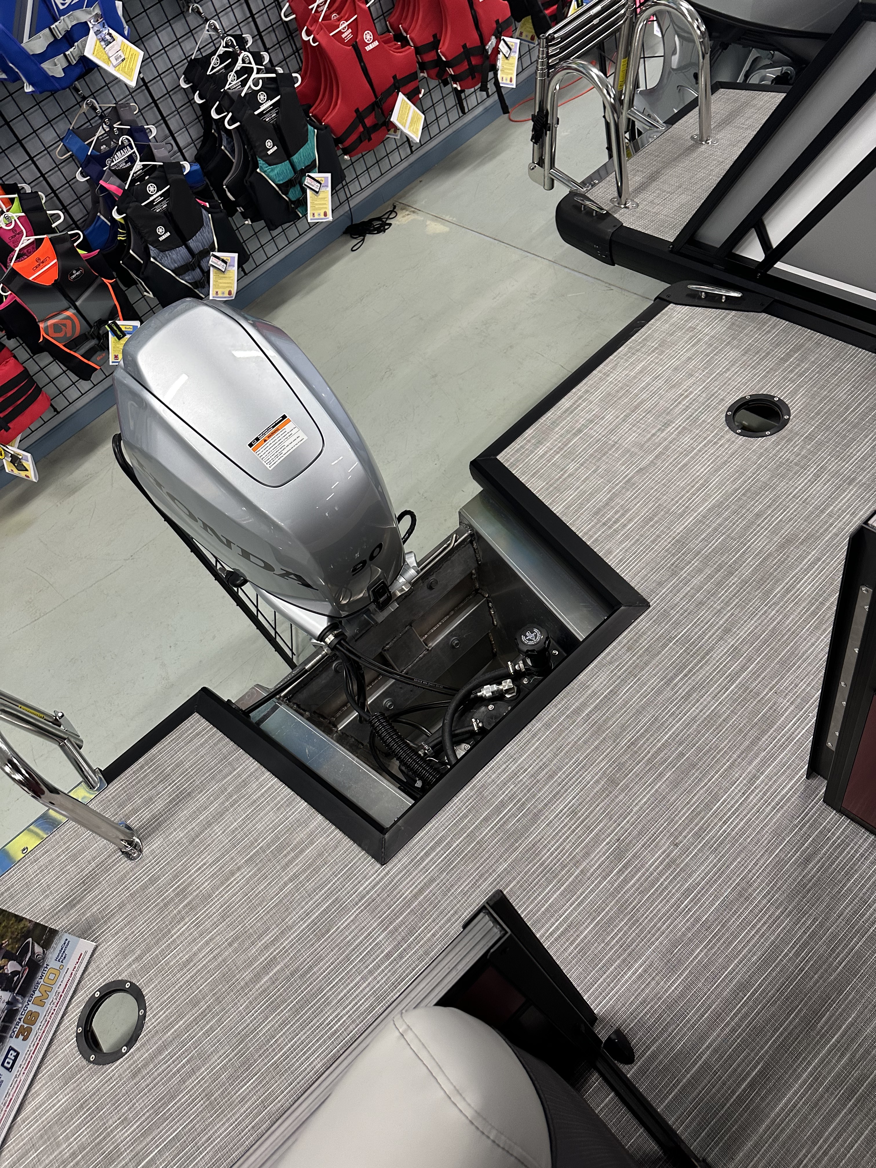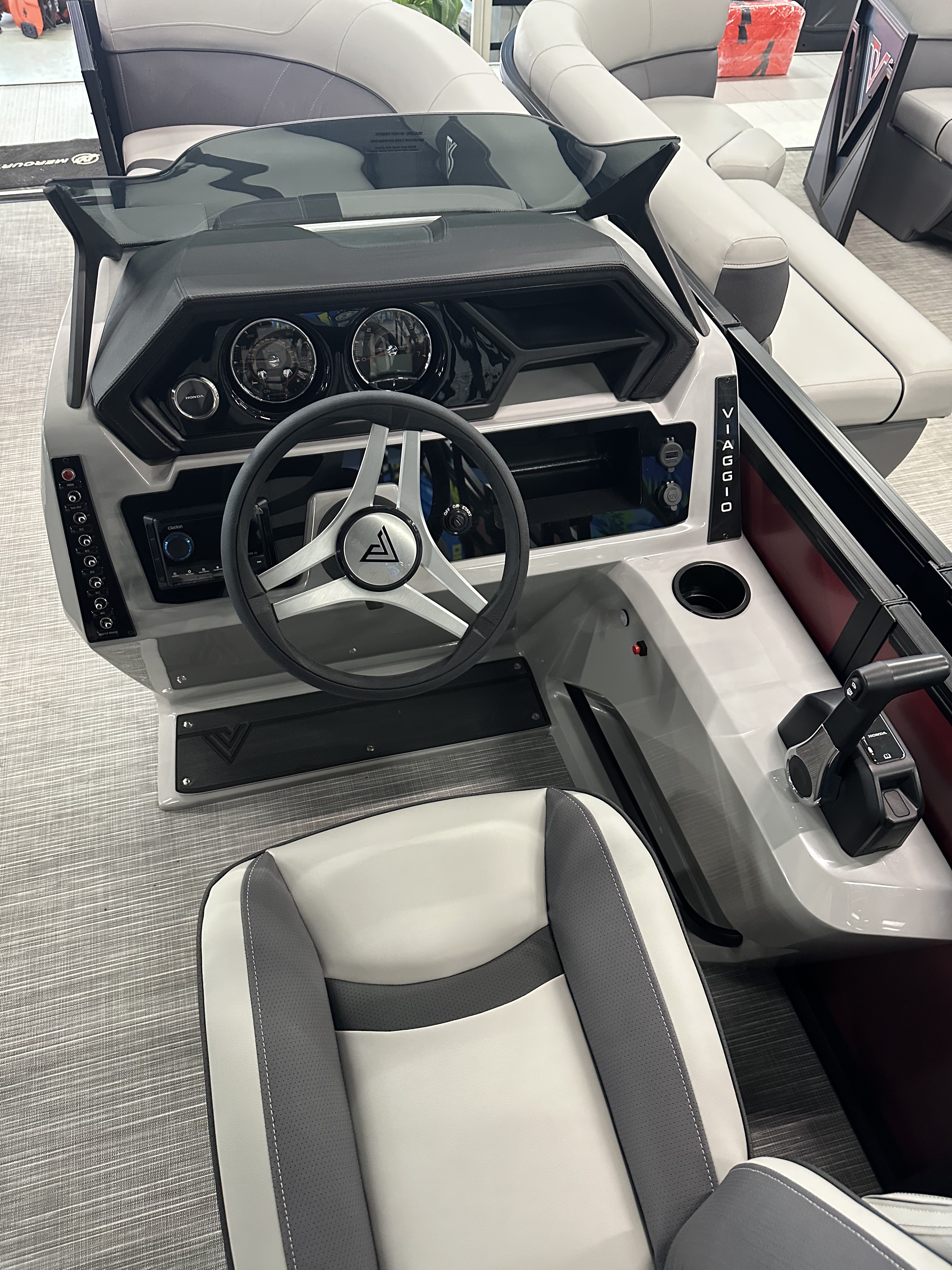 Upgrades include: Honda Pre-rig, Boss MGR350B Reciever and 2 Marine Speakers, Tilt Steering, Upgrade to Low Contour Captains Seat, Seat Slider, Trim Gauge, Windscreen, Tube Protectant, Honda BF 90 HP Motor