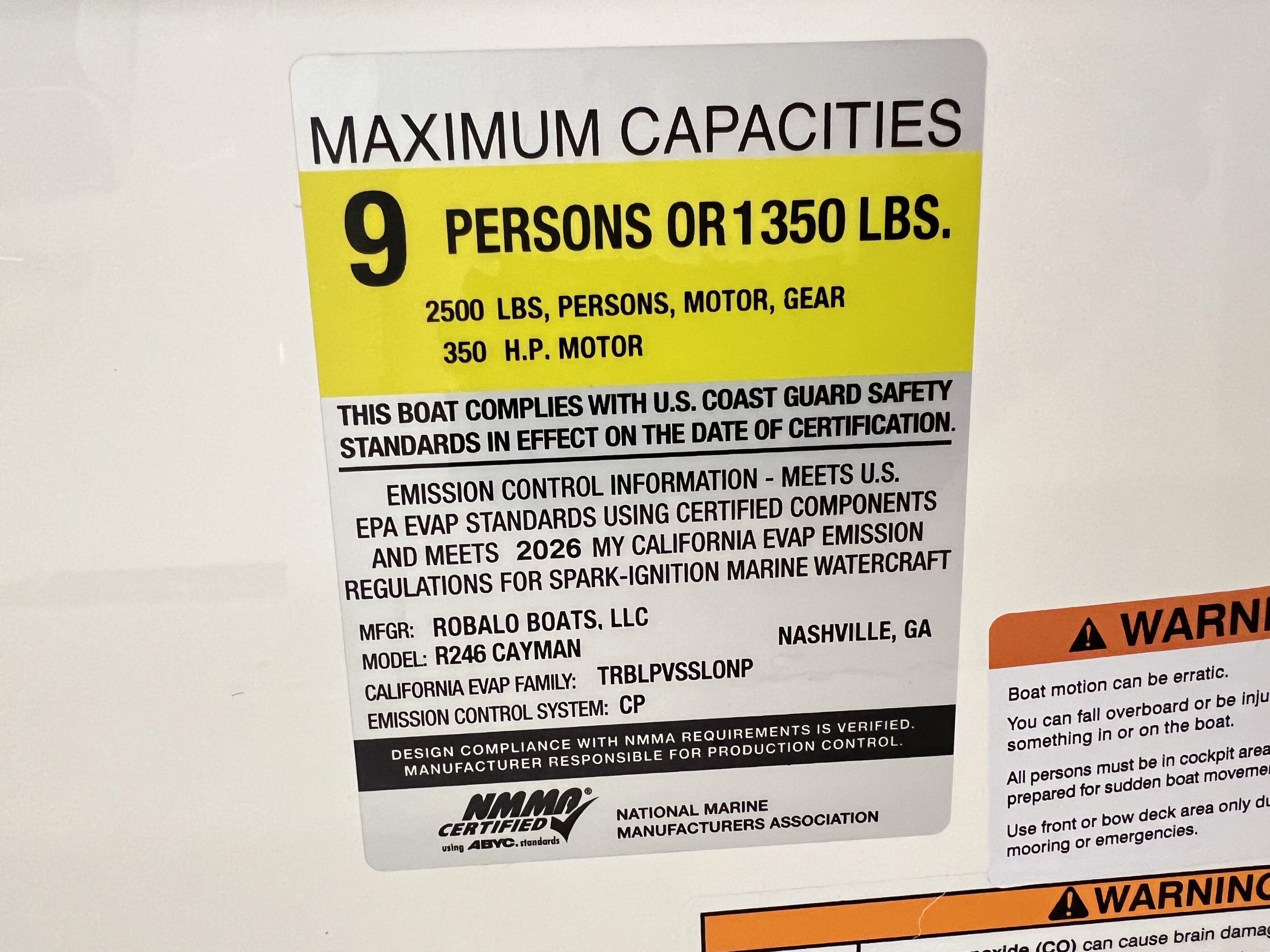 Introducing the magnificent 2026 Robalo 246 Cayman, a fishing machine that's ready to redefine your on-the-water experience. Yamaha 350 Outboard: Feel the surge of power with a state-of-the-art Yamaha 350 engine, offering exhilarating speed and exceptional fuel efficiency.Digital Electric Steering & Throttle: Navigate with effortless precision. The digital controls provide a smooth, responsive, and intuitive feel, making docking and maneuvering in tight spots a breeze.12" Garmin Display: Stay ahead of the fish with a massive, crystal-clear 12" Garmin screen. Navigate confidently and mark your favorite fishing spots with incredible detail.VHF Radio: Stay connected and safe on the water with a reliable VHF radio.Minn Kota Terrova Trolling Motor: Powerful 112# Minn Kota Terrova trolling motor with spot-lock.Versatility: Whether you're targeting reds and trout, or just want to leisurely cruise the bays and bayous, the 246 Cayman exceeds expectations in style, comfort, and performance.Quality & Durability: The 246 Cayman is built to withstand the rigors of serious fishing and provide years of reliable performance.Don't just dream of the perfect fishing boat—own it.Call or visit us today to schedule your private showing and see why the 2026 Robalo 246 Cayman is the perfect boat for the entire family.5 YEAR PREMIUM LEVEL LIMITED COMPONENT WARRANTY12 LB CUSTOM ANCHOR W/ 200 FT ROPE & 15 FT CHAIN36 VOLT MINN KOTA RIPTIDE TERROVA TROLLING MOTORBOW FILLER CUSHIONBOW TABLE WITH DEDICATED STORAGEFRESH WATER SHOWERPREP FEESEADEK HELM MAT - WHITESTAINLESS STEEL DRINK/ROD HOLDERS (2)SPARE TIRE KIT - TANDEM ALUMINUM TRAILER GALVANIZETRIM TABS WITH INDICATORSGEL COATED ENTIRE HULL - ATLAS BLUECOCKPIT INTERIOR - HARBOR ATLAS BLUEHARDTOP UNDERSIDE GEL COLOR - ATLAS BLUEGARMIN GPSMAP 1243XSV WITH B60 TRANSDUCERGARMIN NMEA 2000 STARTER PACKAGE WITH AUDIO INTERFGARMIN VHF RADIO 115